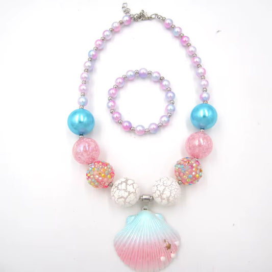 1Set/Lot NEW Child Girls Love Pink Shell Design Pendant with Chunky Bead Bubblegum Necklace Bracelet Jewelry Set for Kids Gift